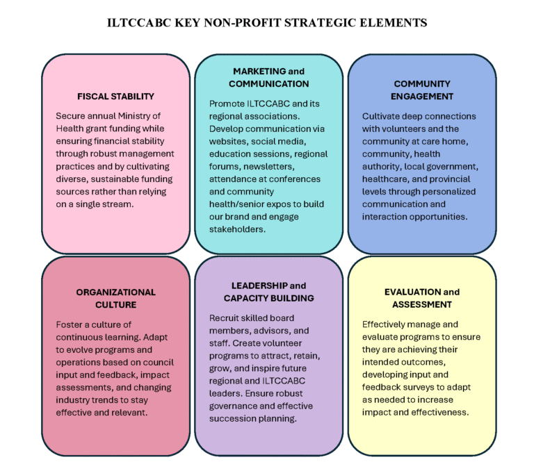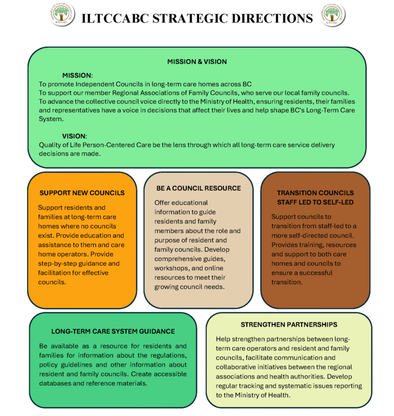 ILTCCABC is a registered society under the BC Societies Act. It is a provincial association of family councils representing the collective voice of residents, their families, and representatives. ILTCCABC is comprised of its member Regional Associations of Family Councils which operate in every health authority in BC. ILTCCABC is viewed by the Ministry of Health as an important partner (stakeholder in the long-term care sector). ILTCCABC contributes to the development and maintenance of independent resident and family councils in LTC.