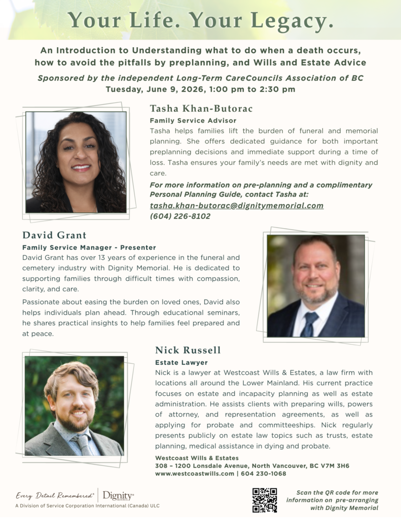 When a loved one dies in long-term care, families are often grieving while also facing urgent decisions, unfamiliar processes, and legal responsibilities. This practical and compassionate education session brings together Dignity Memorial and Westcoast Wills & Estates to help family members understand what to expect and how to be prepared before a death occurs.