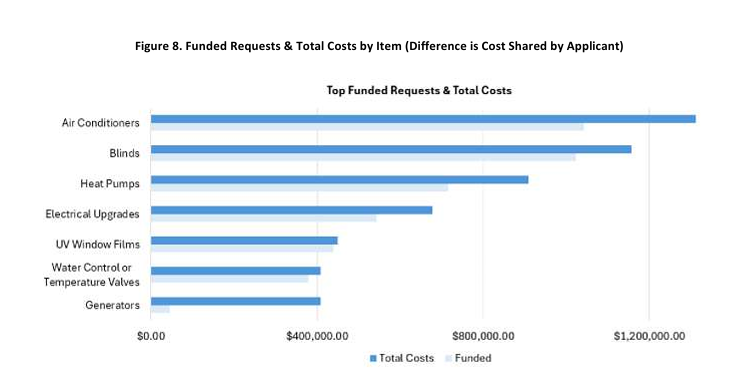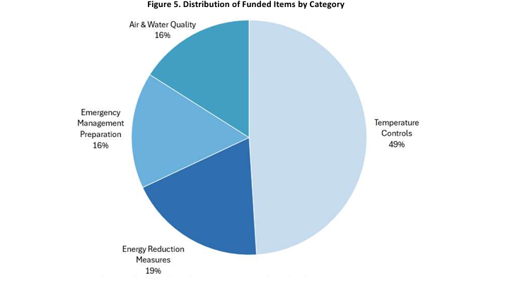 The Climate Action program provided $300 per funded long-term care bed or assisted living suite, for a total of $6 million over 18 months. Temperature control products were the most common purchase (e.g., air conditioners, blinds, heat pumps), followed by energy reduction measures, emergency management preparation and air/water quality measures.